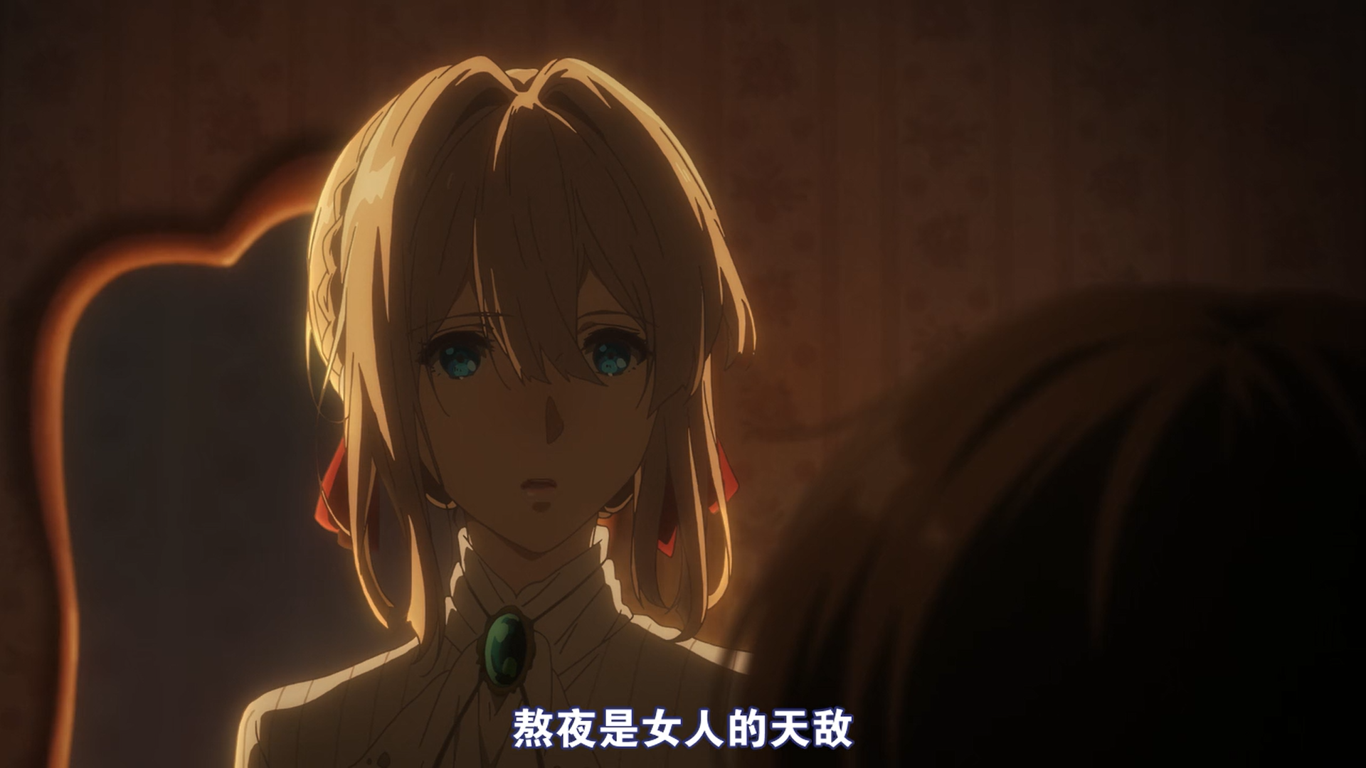 但这部番从各种矛盾入手,对Violet进行了全面的人格塑造:14岁的少女与杀人机器、断送他人的性命与撰写替人结缘的书信,冷冰冰的人偶与不需要指令的”人“。一个个矛盾交织在一起,对每个关键点都有合适的flashback,将故事连贯起来,是我最喜欢的一个方面。